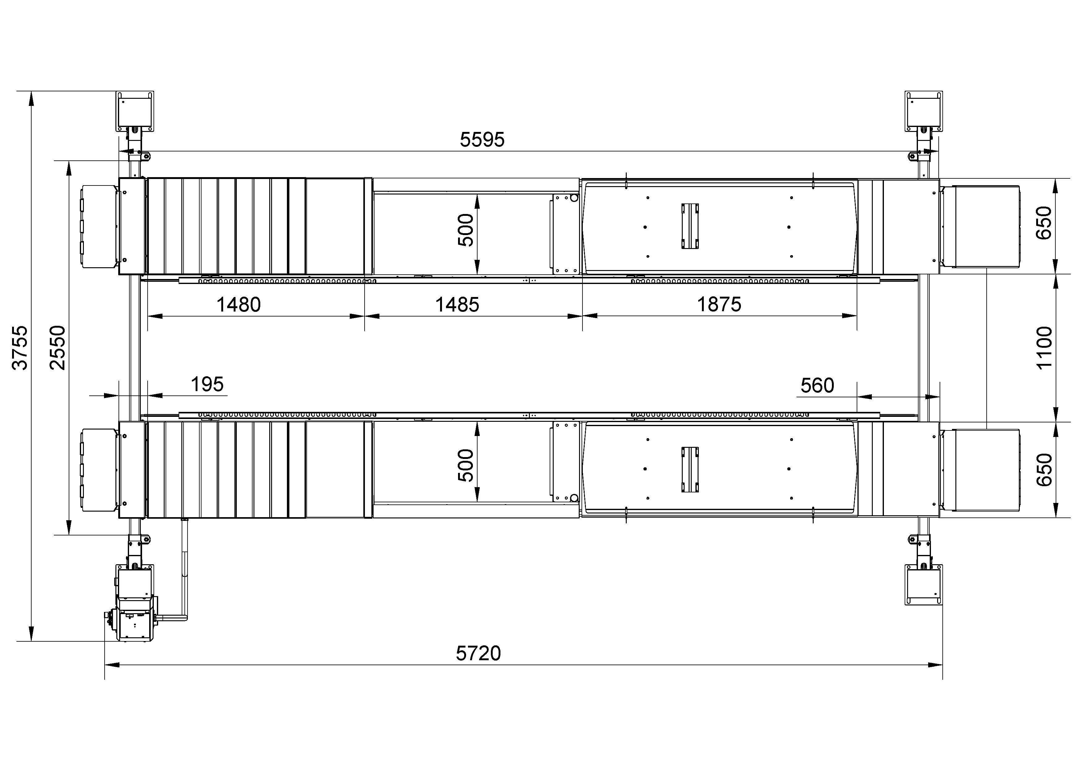 - Chemins de roulement avec levage auxiliaire fixe d’une capacité de levage de 3,5t et kit d‘alignement des roues